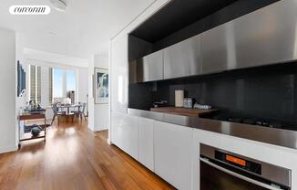This coveted one bedroom, two bathroom plus Dining Room J-line residence, measuring 965 square feet, offers phenomenal views of New York Harbor and downtown New York's iconic architecture . Beautiful morning light pours in through the wall of expansive double-glazed 8'2" windows with southern exposure. Enter this loft-style residence through the large open Kitchen that flows into the grand Dining and Living Rooms. Adjacent to the Kitchen is a custom built-in home office that maximizes space and can easily be concealed. The chef's Kitchen boasts custom designed white lacquer and stainless steel cabinetry, Ceaserstone counter and backsplash and Blanco stainless steel sink with Vola satin nickel faucets. The high-end appliances include fully-integrated Liebherr refrigerator/freezer and Miele Incognito dishwasher, as well as Miele gas cook top and convection oven. Additional features include integrated stainless steel hoods, dimmable cabinet lighting, as well as garbage disposal. The spacious Master Bedroom suite, also facing south, offers those same New York Harbor views and boasts a large walk-in closet. Indulge in the well-appointed Master Bath with exquisitely crafted custom Corian vanity with mirror surround, generous double medicine cabinet with integrated lighting, oversized deep soaking tub, and a separate rain shower and Toto Carolina water closet enclosure. This sleek, contemporary residence features 9'8? ceiling heights, warm Burmese Teak flooring throughout, a built-in home office, Asko washer/dryer, multi-zone climate control system providing heat and AC all year round, high-speed internet, cable television and abundant storage and closet space. Unrivaled amenities include a stunning resident's penthouse lounge with wraparound landscaped terrace, private children's playground, professional screening room, covered dog run, onsite valet parking and Abigail Michael's concierge services. Nearly 18,000 square feet of space is devoted to fitness and exercise including a natural-light filled fitness center with state-of-the-art strength and cardio equipment, indoor 50' heated salt water lap pool, outdoor hot tub, sauna and steam rooms, outdoor half-court basketball, indoor squash court and yoga studio. Fees: Application Fee (Non-Refundable, Due to the Building) $300 Application Processing Fee (Non-Refundable) $500 Dog Fee (Non-Refundable, Only if Applicable) $500 per dog Background /Credit Check Fee (Non-Refundable, Required ) $25 + Tax per applicant First Month rent due at lease signing One month security deposit due at lease signing