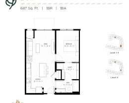 1 bed, 1 bath, 687 sqft
