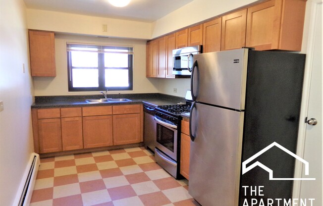 East Rogers Park - 2 Bed 1 Bath 1644 #2C This large two bedroom is on the first floor. Enjoy views of the neighborhood and the tree lined street .Touhy Park and Clark Street are visible from the building, too! Enter in to your new home that has hardwood floor in the living room. The larger living room has a window AC unit and easily will accommodate a large living room set up. The eat in dining room and kitchen make a fashion statement with a checkerboard vinyl tile design. This chef like kitchen is equipped with a standard counter tops. There is an abundance of wooden cabinets. The complimentary appliances are stainless steel and includes a microwave and dishwasher. Looking into the bedroom with the carpeted floors and larger closets and you will notice the large mirrors, too. The bedrooms will take a larger bed and furniture. The bathroom has also been recently updated. The large vanity and white tiles brighten the space. There is a soaking bathtub that includes a sho