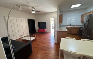 Ground-floor unit featuring beautiful plantation shutters and a comfortable, functional layout. This 2-bedroom, 2 full-bath home is partially furnished or unfurnished and offers hardwood flooring throughout the main living areas, with tile in the bathrooms for easy maintenance. The nicely sized kitchen includes stainless steel appliances, and a washer and dryer are also provided for convenience. Enjoy relaxing on the covered patio, along with access to community amenities including a pool and spa. Assigned covered parking included