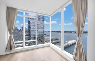 Experience NYC living at its finest in this magnificent, pristine FULLY FURNISHED or UNFURNISHED corner unit in the uber-luxurious Waterline Square! This spacious two bedroom, two bath residence features City and Hudson River views throughout and gets fantastic light courtesy of the floor-to-ceiling windows. Blessed with a gracious entry foyer and two spacious bedrooms, this unit also boasts a large open plan living/dining room adjacent to the chef's kitchen with marble countertops and a waterfall island/breakfast bar, Gaggenau appliances, Dornbracht fixtures, vented range hood, wine refrigerator, and garbage disposal, The king-sized primary bedroom has generous closet space and a gorgeous en suite spa bath with double sinks, separate standalone shower, deep soaking tub, and abundant storage. The sizable second bedroom with a Murphy bed is located opposite another marble bathroom with excellent storage and a combination shower/tub. Other hallmarks of this incredible home are washer/dryer units, motorized solar and black out shades in both bedrooms and the living/dining room, custom organizers in all closets, high ceilings, beautiful hardwood floors, and multi-zone central A/C and heat. The numerous amenities in this ultimate full-service building include a full-time doorman and live-in super, a sundeck with two outdoor kitchens, a residents' lounge with balcony, media room, billiards table, bar, and private dining room with catering kitchen,. Additionally, you will have access to the Waterline Club, a remarkable 100,000-SF amenity package including every sports, fitness, and leisure amenity imaginable: an indoor tennis court, full basketball court, indoor soccer field, half-pipe, rock climbing wall, boxing studio, 25-meter lap pool, spa, art studios, indoor gardening, bowling alley, screening room, game rooms, and children's playrooms. Located minutes from the West Side Highway and Hudson River Esplanade (where one can run/walk/jog/bike to Harlem or down to Battery Park and the Southern tip of Manhattan), as well as a few blocks from Columbus Circle and all the transportation options, amazing restaurants, and the Whole Foods that are all there. This beautiful apartment is available FULLY FURNISHED, as depicted in the photos (including all TVs, window treatments, kitchenware, linens, etc) or UNFURNISHED and is available for one or more years from April 1, 2026on. Sorry, but no pets allowed.
