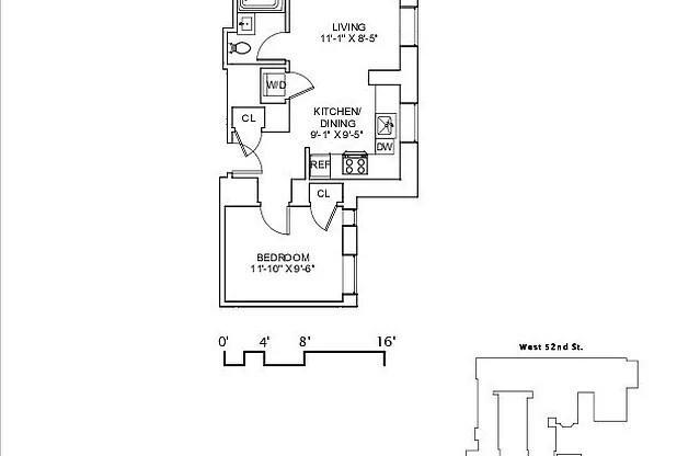 This thoughtfully designed apartment is filled with natural light and offers open city views. The residence features oversized windows, hardwood flooring, central air conditioning, and an in-unit washer and dryer. The apartment is currently occupied, and a minimum of 24 hours' notice is required for showings. The well-planned layout includes a spacious open kitchen surrounded by large windows that bring in abundant natural light. The kitchen offers generous counter and storage space with custom gray and white lacquer cabinetry, elegant Caesarstone countertops, a stainless steel Kohler sink, and premium built-in appliances-creating a perfect balance of modern design and everyday functionality. Situated in the heart of Hell's Kitchen at the corner of Ninth Avenue and 52nd Street, **Nine52** is a newly completed luxury residential building. Nine52 features contemporary architecture along with a wide range of amenities designed to enhance residents' lifestyles. These include a 24-hour doorman, complimentary on-site bike service, and a dedicated co-working space with two conference rooms and three individual workstations. Residents can also enjoy a landscaped courtyard with a peaceful waterfall stream, a state-of-the-art fitness center, spinning studio, yoga room, and a residents' lounge. Additional amenities include a wine cellar with a private dining room, a children's playroom, and a rooftop terrace with unobstructed panoramic city views.