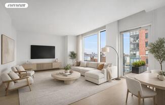 Originally developed as a luxury condominium, The Oskar now rises as Midtown West's most prestigious rental address, a quiet masterpiece where art, architecture, and modern comfort converge. The two bedroom residences offer thoughtfully proportioned layouts with in-unit laundry, private terraces, and open kitchens that elevate daily living with effortless sophistication. Step into refined elegance in this stunning two-bedroom, two-and-a-half-bath residence. A thoughtfully designed open layout maximizes both space and light, highlighted by high ceilings and oversized floor to-ceiling windows. With full southern exposure throughout, the home is bathed in natural sunlight from sunrise to sunset. A private terrace, accessible from the living room, provides the perfect setting to enjoy the outdoors while taking in sweeping city views. The custom European-inspired kitchen is a study in refined functionality, showcasing a full Bosch appliance suite, Caesarstone countertops, and thoughtfully designed cabinetry with integrated pull-out soft close drawers. The spa-inspired baths create a calming sanctuary, featuring glass-enclosed rainfall showers, neutral designer tilework, and elevated fixtures that bring a sense of luxury to everyday living. Bedroom one offers a private en suite bath and a dedicated dressing area, providing both comfort and seclusion. Bedroom two also enjoys its own en suite bath along with direct access to a private terrace, creating a peaceful retreat. The home is complete with a built-in washer and dryer and three generous closets, all customized with tailored shelving and thoughtful storage solutions. Residents enjoy an enviable suite of amenities, beginning with a beautifully landscaped rooftop terrace framed by sweeping skyline and Hudson River views, complemented by a sculpted lawn by HMWhite. A tranquil second-floor garden patio, a state-of-the-art fitness studio equipped with Peloton and Technogym, and an elegant resident Living Room offering workspace, dining, and library settings that elevate the experience. The attended lobby, with its 24-hour concierge, provides a peaceful and polished welcome home. Perfectly positioned at the convergence of the dynamic Hudson Yards and the ever-evolving Hell's Kitchen, Oskar offers unparalleled access to some of Manhattan's most vibrant cultural, culinary, and waterfront destinations. Residents are moments from the Hudson River, Midtown West, West Chelsea's celebrated galleries, and the iconic High Line.