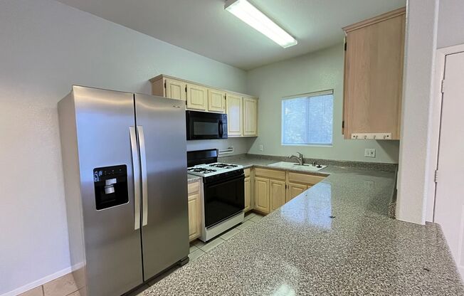 This open floor plan condo offers 2 bedrooms with 2 full bathrooms! New stainless steel refrigerator & lots of countertop and cabinet space for a small unit! Primary bedroom with bathroom attached, dual closets, shower with separate tub. Full size washer/dryer machines inside the unit, covered patio, 1 covered parking spot, gated community with pool/spa & fitness center! Close to shopping, dining and community parks! All applications must be submitted online at Application fee $30per adult non-refundable. Any incomplete applications may be rejected. All applications are subject to credit history, income verification, and rental history. Approved tenant to pay $150 lease prep fee