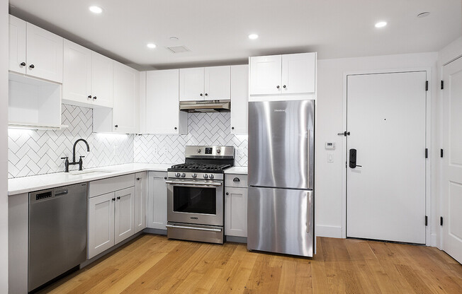 One bedroom residence with industrial-chic oversized windows, open island kitchen, great closet space, and an in-unit Bosch, washer & dryer. The custom kitchen features Caesar stone countertops, modern stainless-steel appliance package, full-sized dishwasher, herringbone white ceramic tile backsplash, oil rubbed bronze faucet, Kohler sink and soft-close cabinets. The spa-like bathrooms are outfitted with a deep walnut vanity, Caesar stone backsplash, Moen faucets with Kohler sinks and toilets, and white herringbone ceramic tile walls. Each room has individually controlled digital thermostats and soundproof windows. Amenities offer the utmost in convenience: fully-furnished roof deck with two grilling stations, wet bars, private dining stations, lounge chairs and outdoor shower; resident fitness center; workspace lobby lounge with free WiFi; Butterfly MX Security and Intercom system; green backyard garden; private storage cages, parking garage and bike storage. Pets and guarantors are welcome. Some restrictions apply. Pictures depict typical finishes in the building and might not be of an actual unit. Disclosure of Fees: First month's rent equal to one month's gross rent Security deposit equal to one month's gross rent