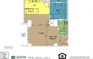 1 bed, 1 bath, 668 sqft
