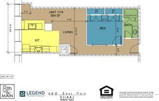 1 bed, 1 bath, 684 sqft