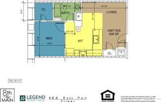 1 bed, 1 bath, 628 sqft