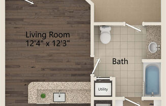 Studio, 1 bath, 664 sqft